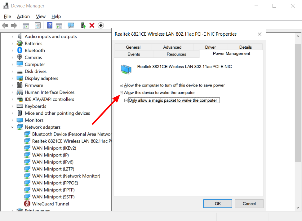Next, go to the Power Management tab and allow the device to wake the computer from sleep using a Magic Packet.